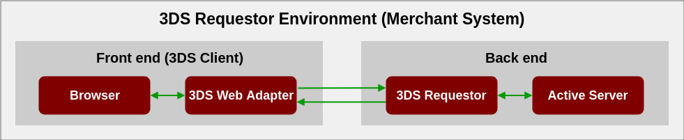 To utilise 3DS2, the merchant site needs to implement two parts: a 3DS web adapter at the front end and a 3DS Requestor at the back end. The following diagram shows the relationship between the browser, the 3DS web adapter, the 3DS Requestor and ActiveServer: