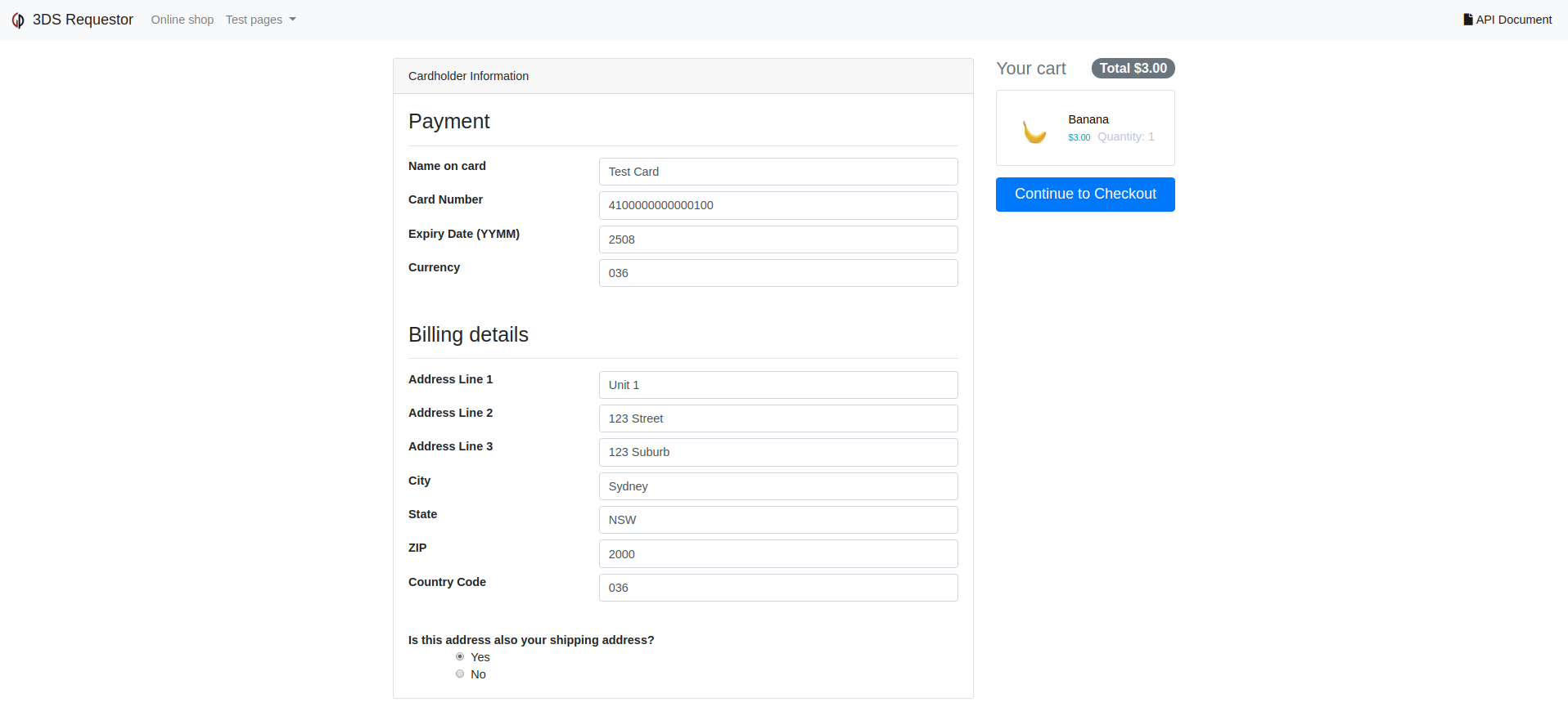 Default payment and billing information has been pre-filled, including a card number, which can be used to complete the transaction. Select the Continue to checkout button to trigger the 3DS2 authentication process.