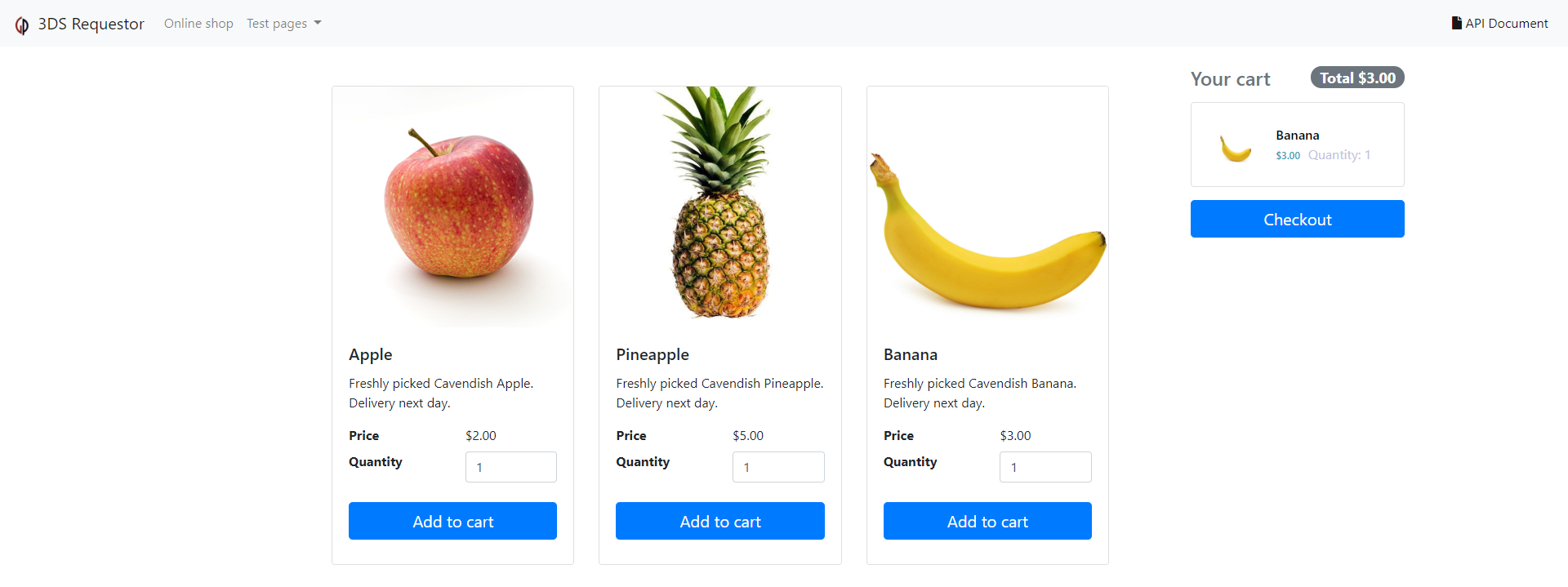 To initiate a frictionless transaction, open the demo merchant website, launch the Online shop page, and add an item to the cart.
