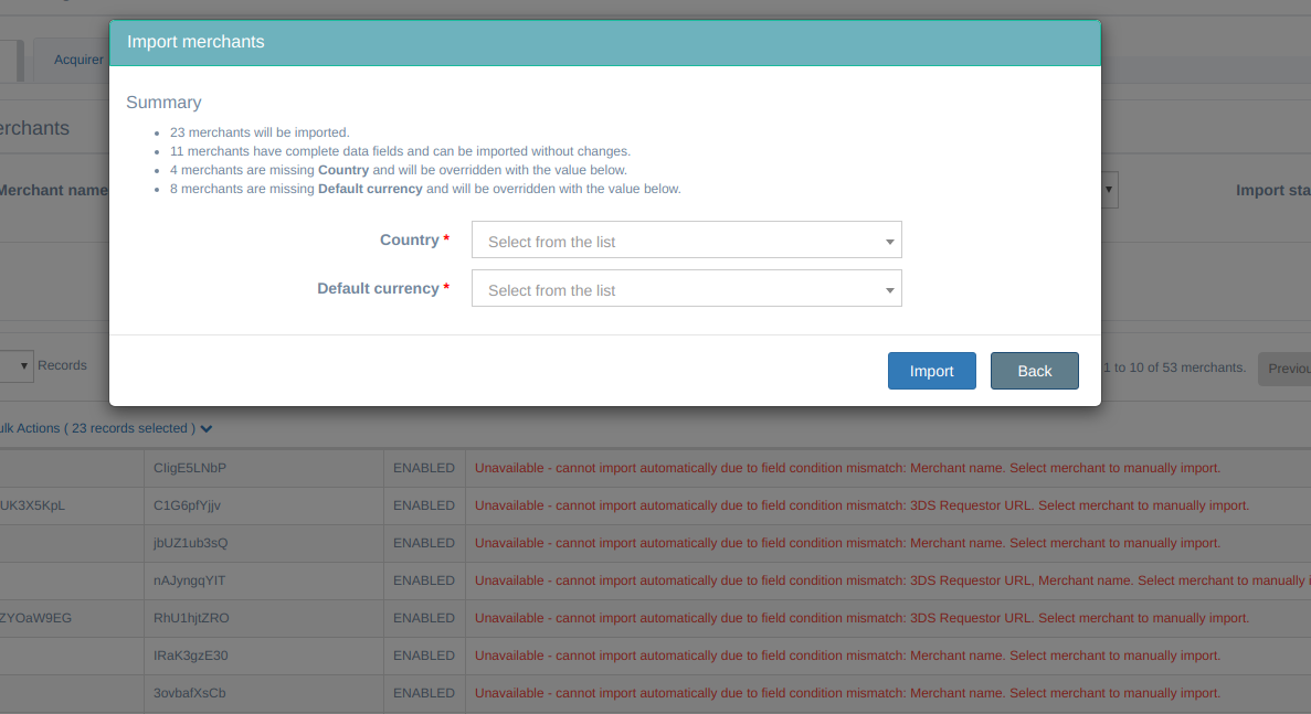インポートステータスがWarningの加盟店を選択している場合には、このダイアログで、デフォルト値を選択してインポートに使用するよう求められます。未入力欄がある加盟店が複数存在し、同じデフォルト通貨または国名の入力が必要である場合に、この機能は便利です。