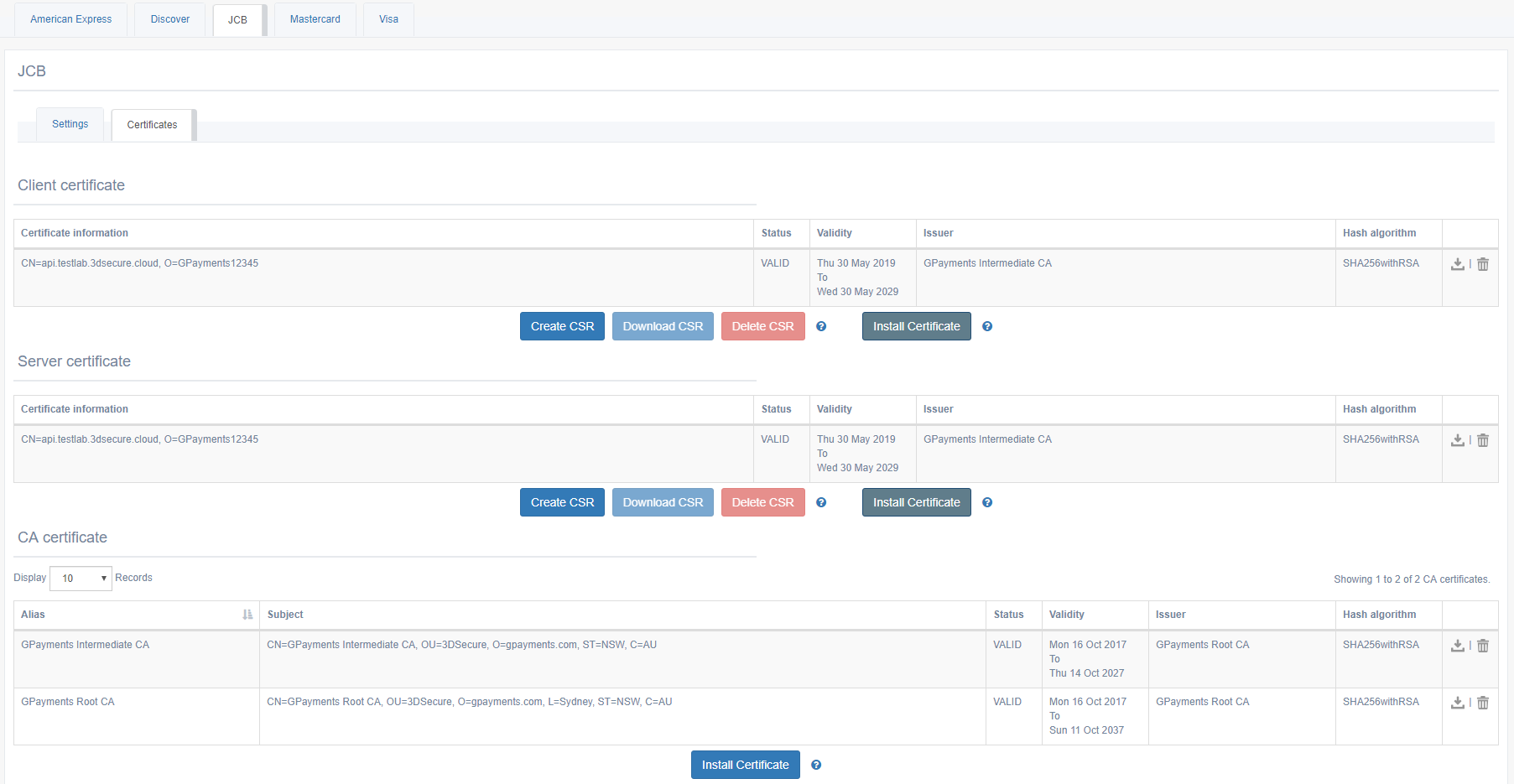 もし、国際ブランドがクライアントとサーバーの接続に必要な証明書が1つだけの場合、Server certificate is the same as the client certificateオプションを選択できます。これにより、クライアントセクションとサーバーセクションの両方に証明書がインストールされます。