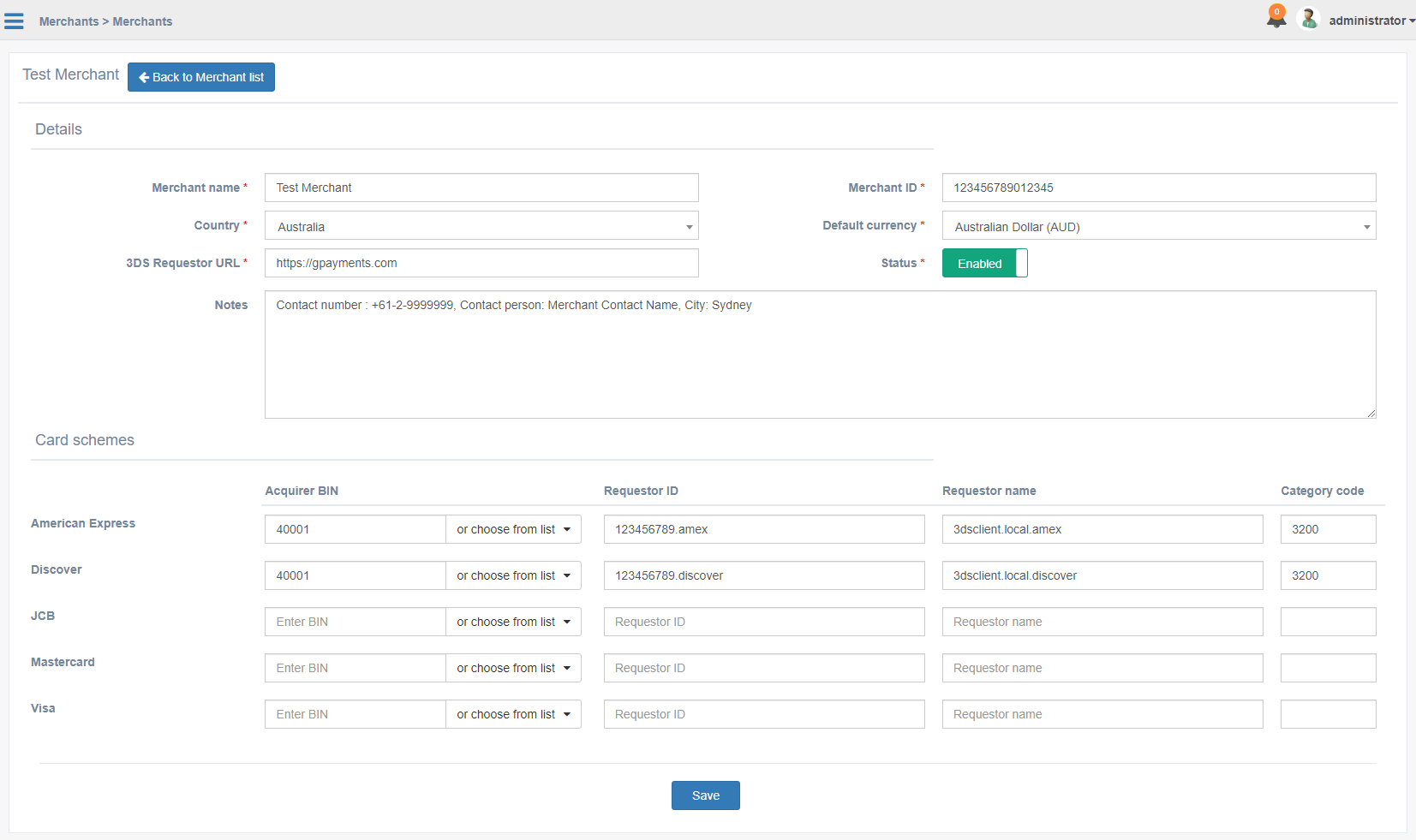 - Status - 加盟店がenabled(有効)かdisabled(無効)かを示すステータス。 加盟店を無効にすると、その特定の加盟店に対して認証APIリクエストが許可されなくなります。