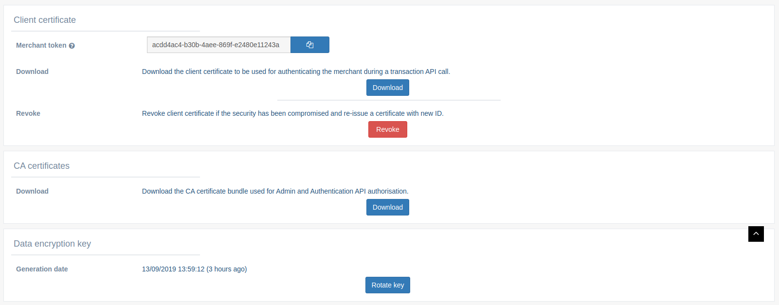 加盟店のクライアント証明書およびマーチャントトークン、およびサーバーCA証明書は、このページからアクセスできます。さらに、ユーザーはセキュリティーのためにデータ暗号化キーを管理できます。