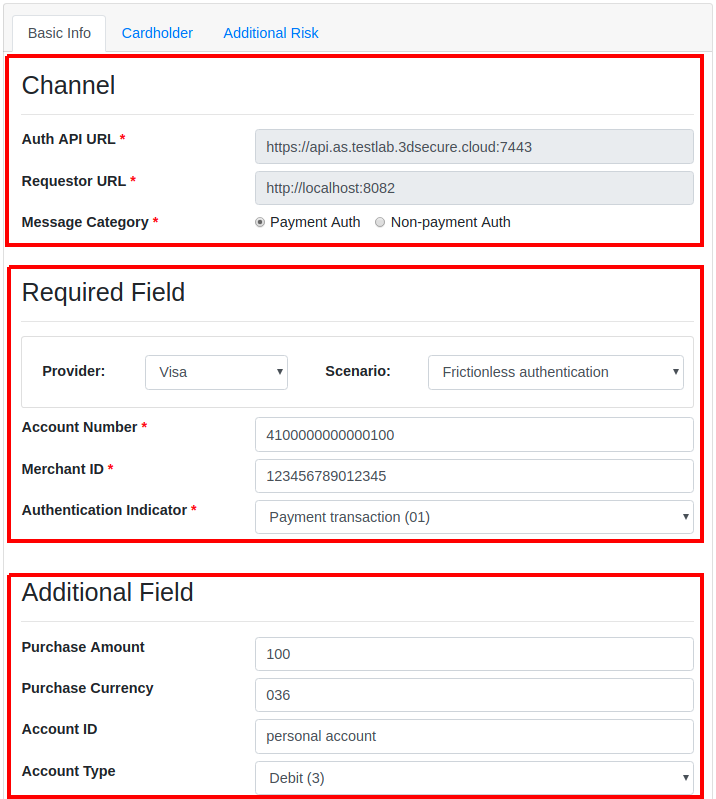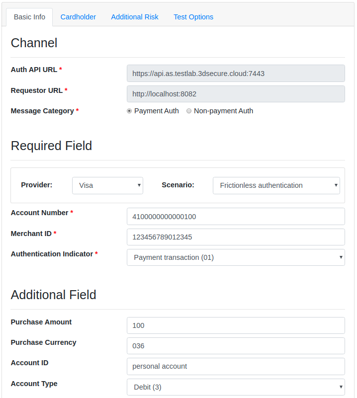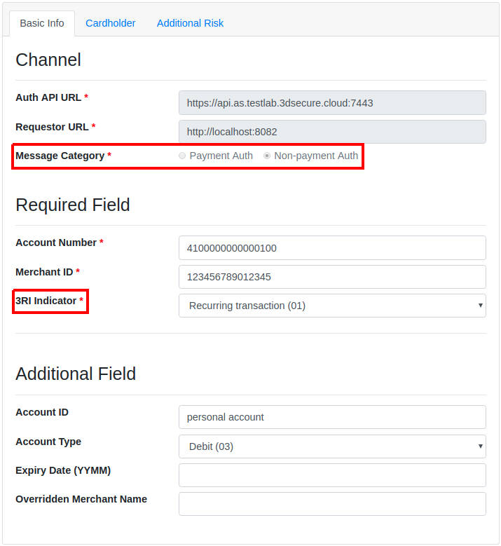 BRWテストページと同様に、3RIテストページにもBasic Info(基礎情報)、Cardholder(カード会員)、Additional Risk (追加リスク)の3つのカードがあります。1つの違いは3RI IndicatorパラメータがRequired Field (必須項目)内にあり、Additional Field (追加項目)内に無い事です。その他の違いとして、3DS Requestor Initiatedは非決済認証のみに使用される為、Message Categoryを選択する事が出来ません。