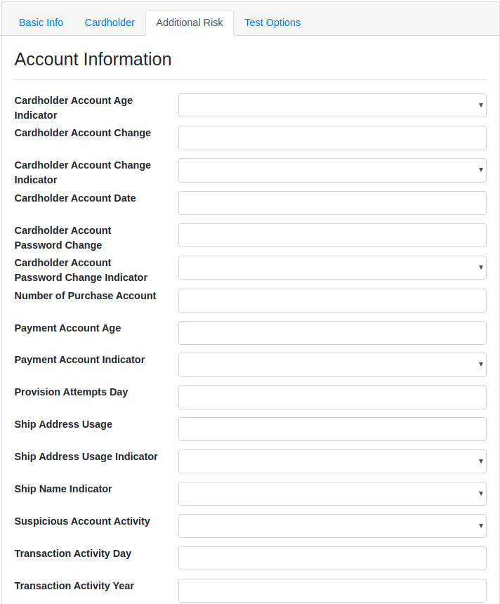 Additional Risk (追加リスク)タブでは、アカウント情報、リクエスターの認証情報、加盟店リスク情報のような追加のリスク情報を入力する事が出来ます。