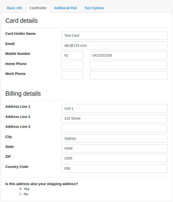 BRWテストページにはBasic Info(基礎情報)、Cardholder(カード会員)、Additional Risk (追加リスク)の3つのタブがあります。
