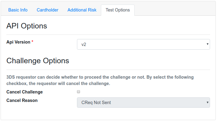 Test Optionsタブでは、Cancel Challengeチェックボックスをオンにすることで、ACSが取引に対してチャレンジを要求した場合にチャレンジをキャンセルすることを選択できます。チャレンジをキャンセルすると、 3ds-web-adapterはiframeでCReqコールバックページを実行しません。必要に応じて、challengeStatusのエンドポイントを使用して、Cancel Reason (キャンセルの理由)を指定し、ActiveServerにチャレンジをキャンセルした理由を通知します。