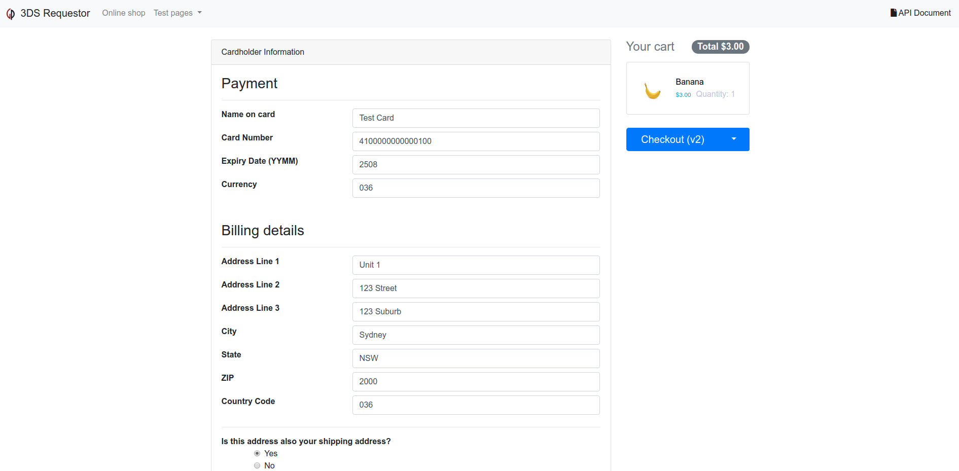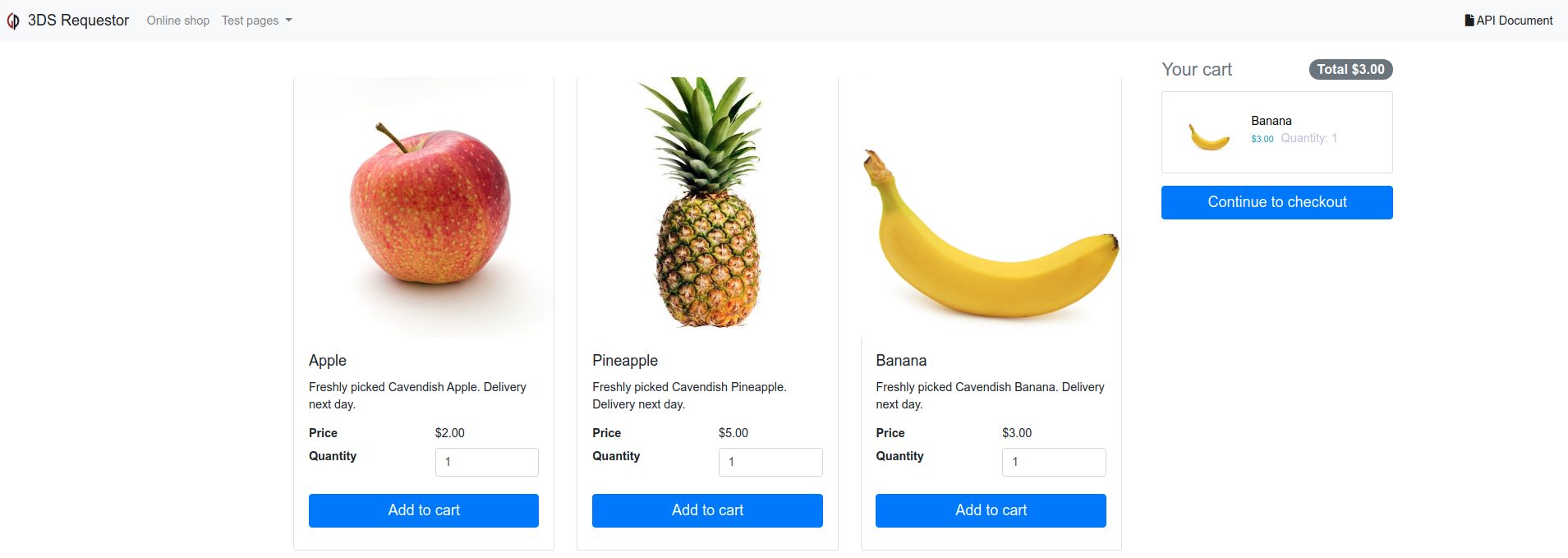 オンラインショップは、どのように3DS2を電子取引サイトに統合するかを加盟店視点で提供する、デモの加盟店のチェックアウトページです。統合の実装については、統合ガイドに従ってください。