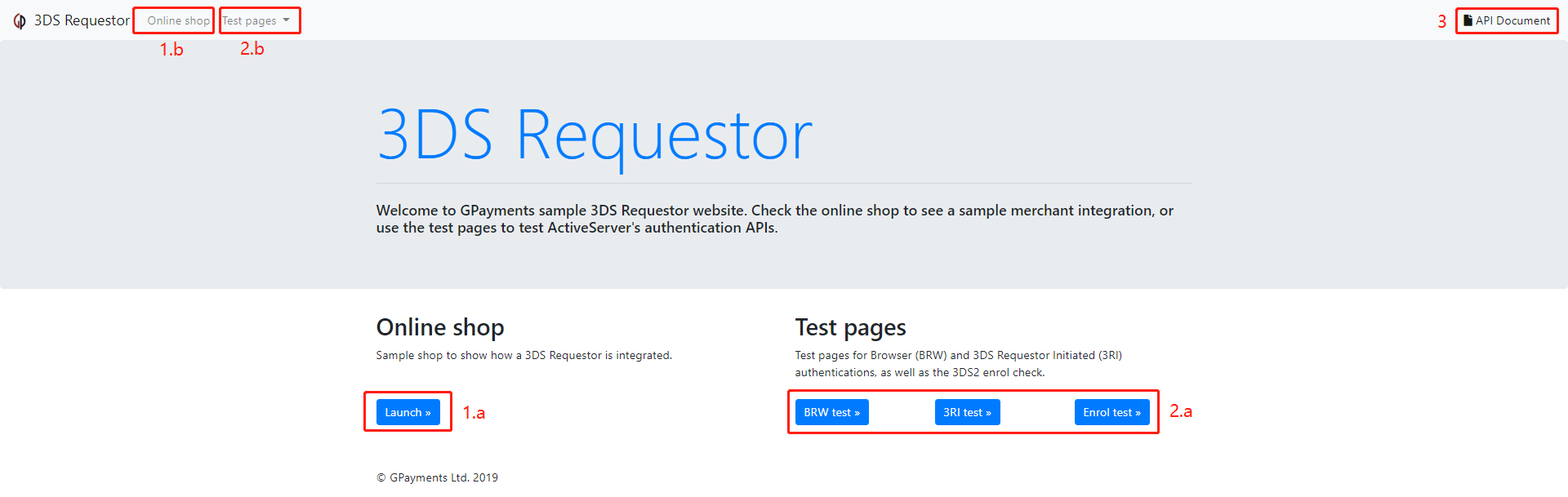 以下に表示されているのは弊社の3DSリクエスターサイトのホームページです。 オンラインショップとテストページの2つのセクションがあります。オンラインショップはLaunchボタン(1.a)を選択する、もしくは左上のOnline shopボタン(1.b)を選択する事でアクセス出来ます。それぞれのテストページは関連ボタン(2.a)を選択する、もしくは左上のTest pagesドロップダウン(2.b)を選択する事でアクセス出来ます。加えて、右上にActiveServer認証APIドキュメントへのAPI Documentのリンク(3)があります。