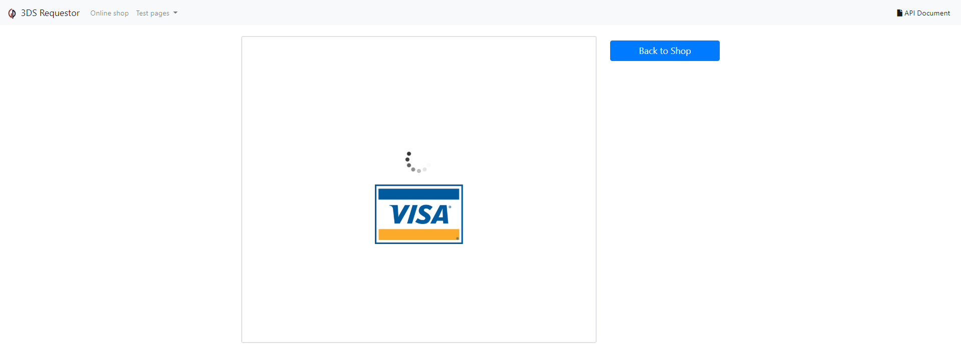 テストページのどれか1つでTestXXXボタンを選択すると、process.html移動します。すべての3DS2プロセスはprocess.htmlページで処理されます。3DS2プロセスが実行中の間はスピナーが表示されます。3DS2プロセスが完了すると、同じページ内に結果が表示されます。