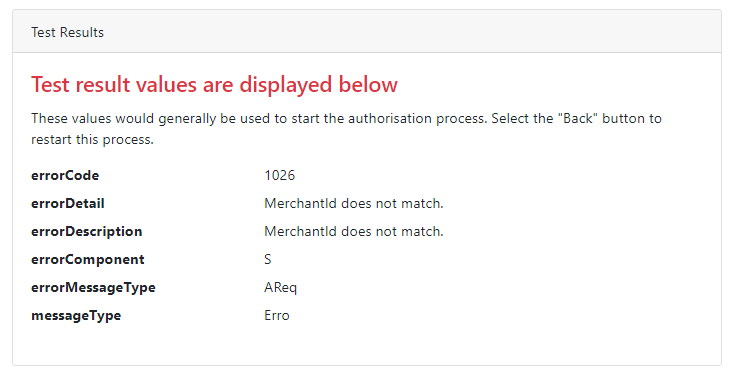 もしくは、不正なパラメータをBRW testページ内で入力すると(例えばMerchant IDに000)、エラーを返します。
